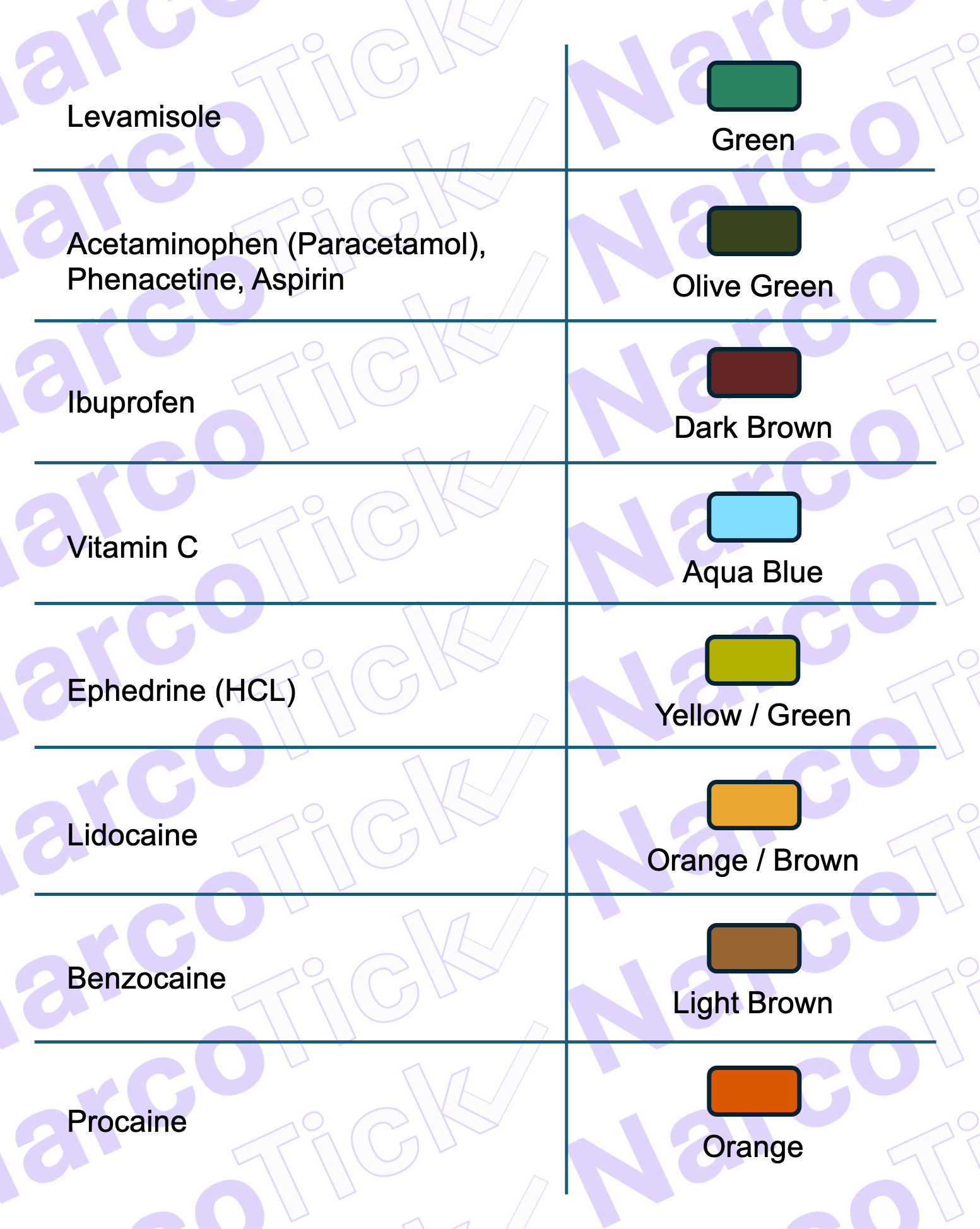 Step 4: Compare the colour from the reagent granulate with the colour chart below. Note: Uncut cocaine does not react with this test!