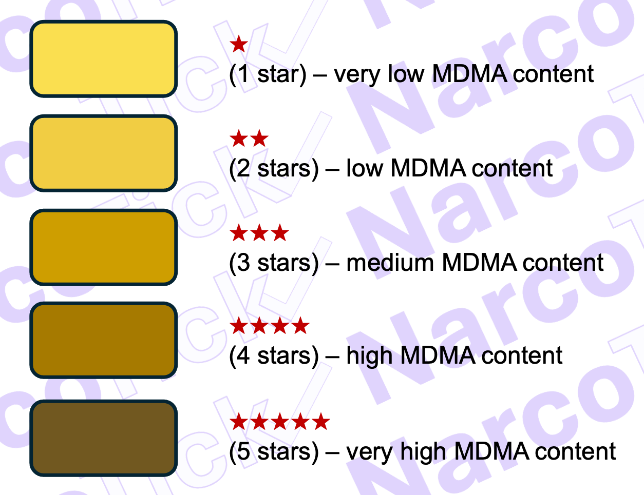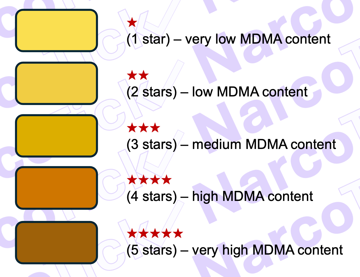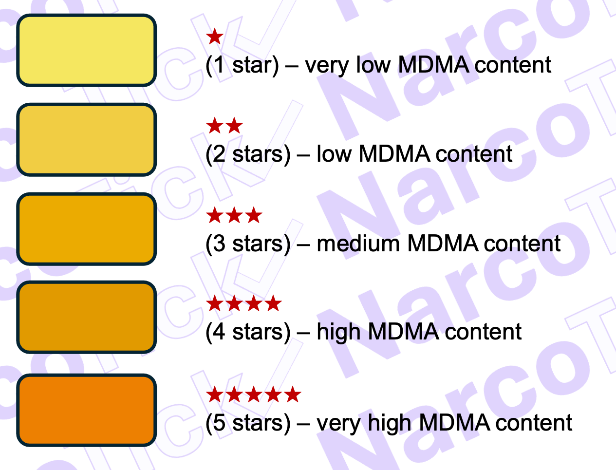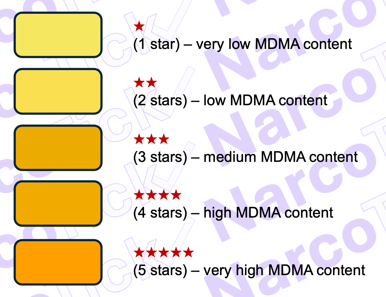 Step 4: Let it stand for at least 5 minutes because the color will darken slowly. Then carefully shake the ampoule for 5 seconds to make the color homogeneous. Look at the top layer of the ampoule liquid and compare the colour from the reagent granulate with the color charts below. MDMA only colors the top layer of the test so if the bottom layer gives a color this may be from an adulterant.